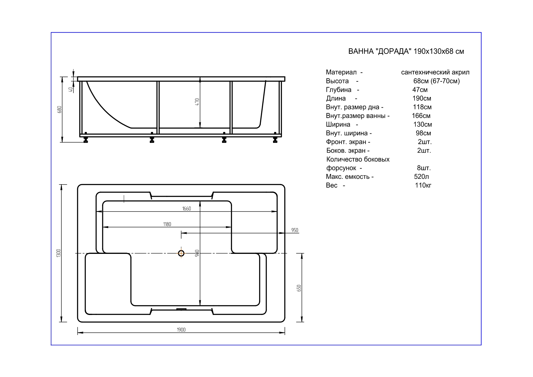 Акриловая ванна Aquatek Дорадо 190x130 прямоугольная, универсальная, с каркасом, без гидромассажа