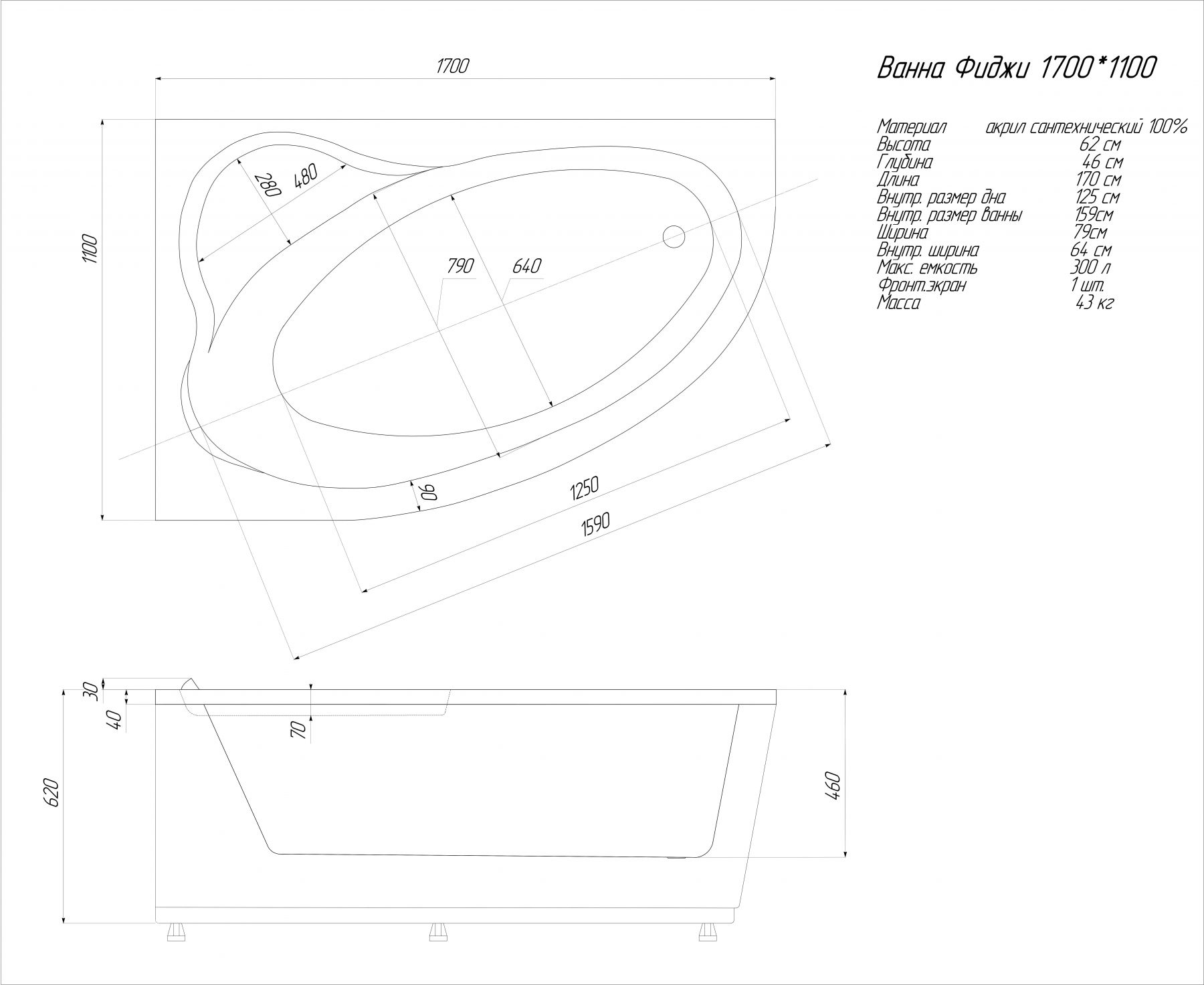 Акриловая ванна Aquatek Фиджи 170x110 асимметричная, правая, с каркасом и экраном, без гидромассажа