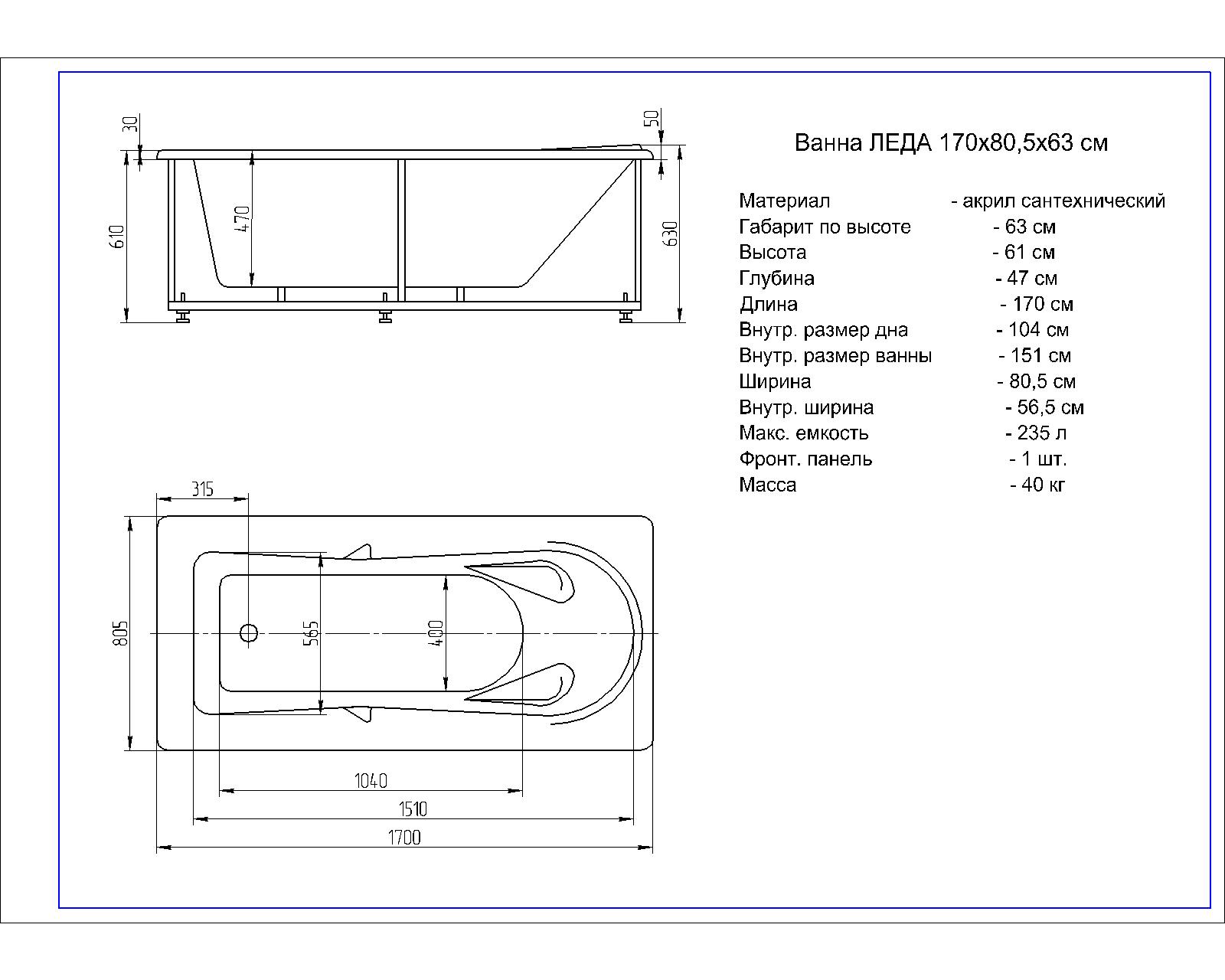 Акриловая ванна Aquatek Леда 170x80 прямоугольная, слив справа, с каркасом и экраном, без гидромассажа