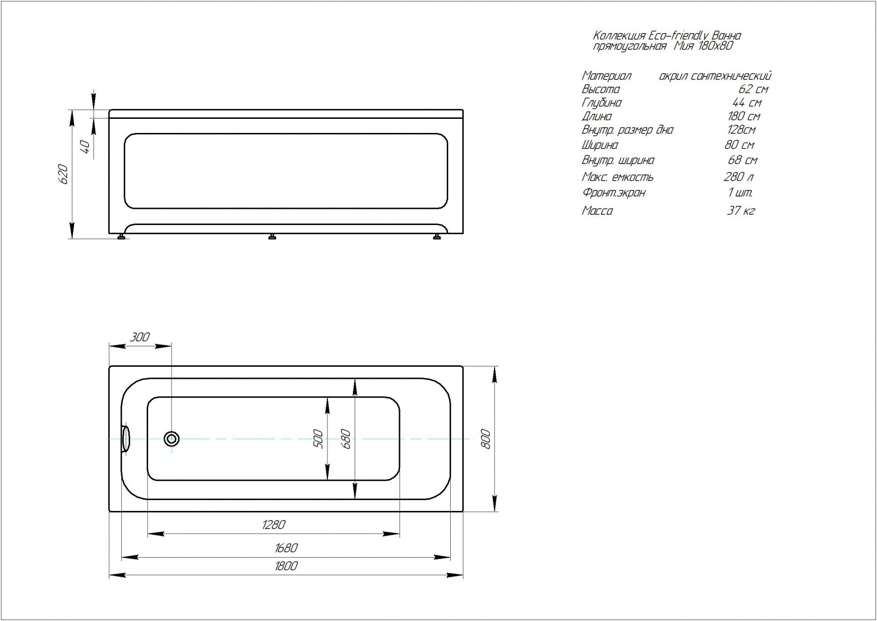 Акриловая ванна Aquatek Мия 180x80 прямоугольная, без каркаса и экрана