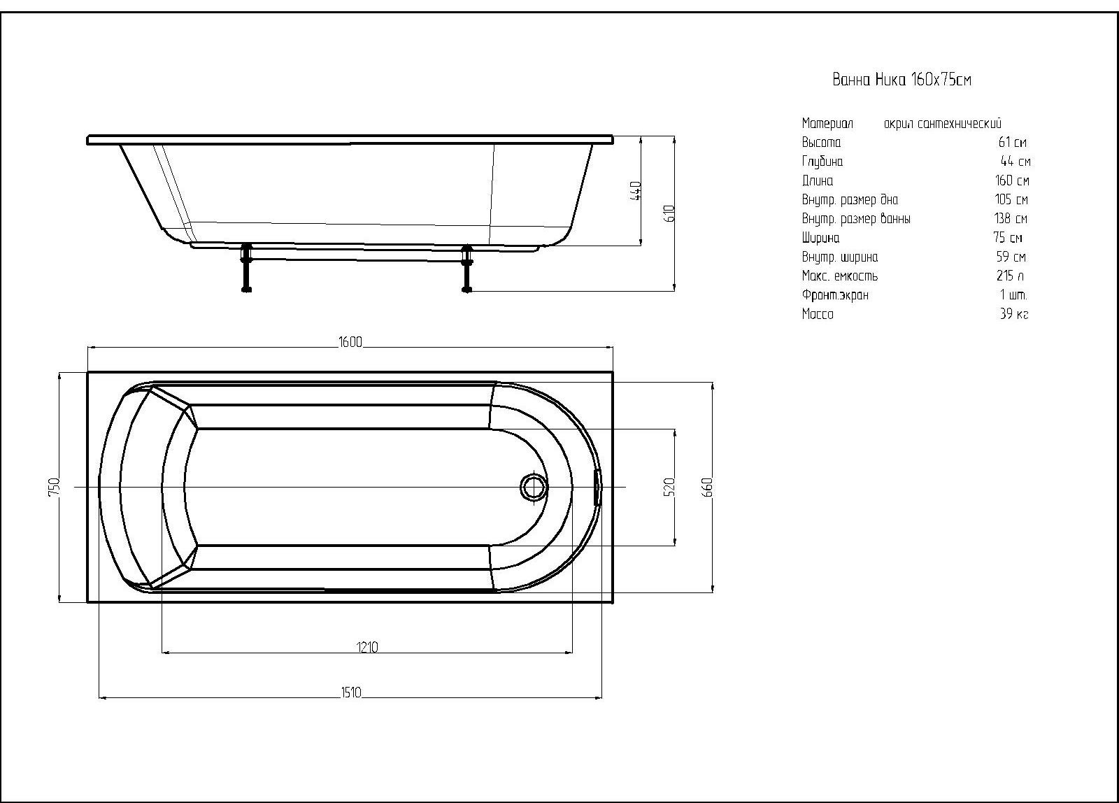 Акриловая ванна Aquatek Ника 160x75 прямоугольная, без каркаса и экрана