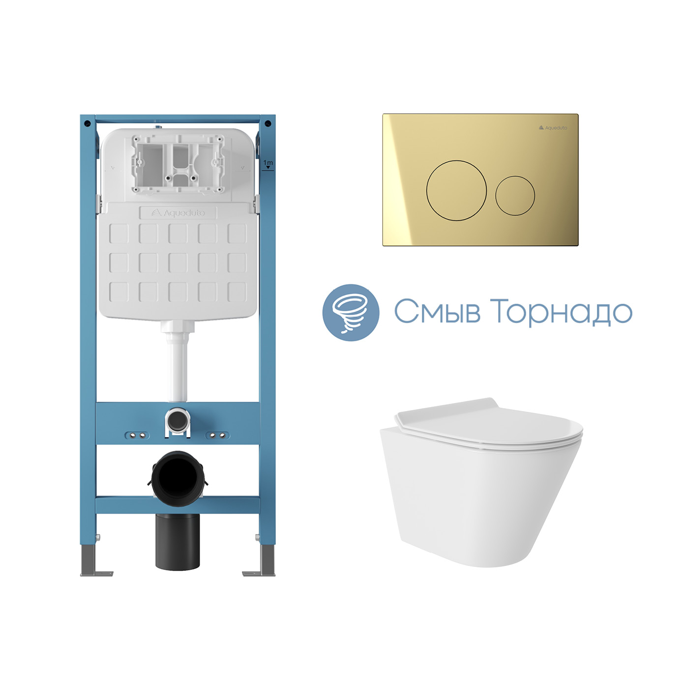 Aqueduto комплект: TECNICA Novo Система инсталляции для подвесного унитаза, CIRCULO Novo Панель смыва, Золото, CONE Tornado S Унитаз подвесной 480*360 безободковый, Tornado, сиденье с микролифтом, белый глянцевый