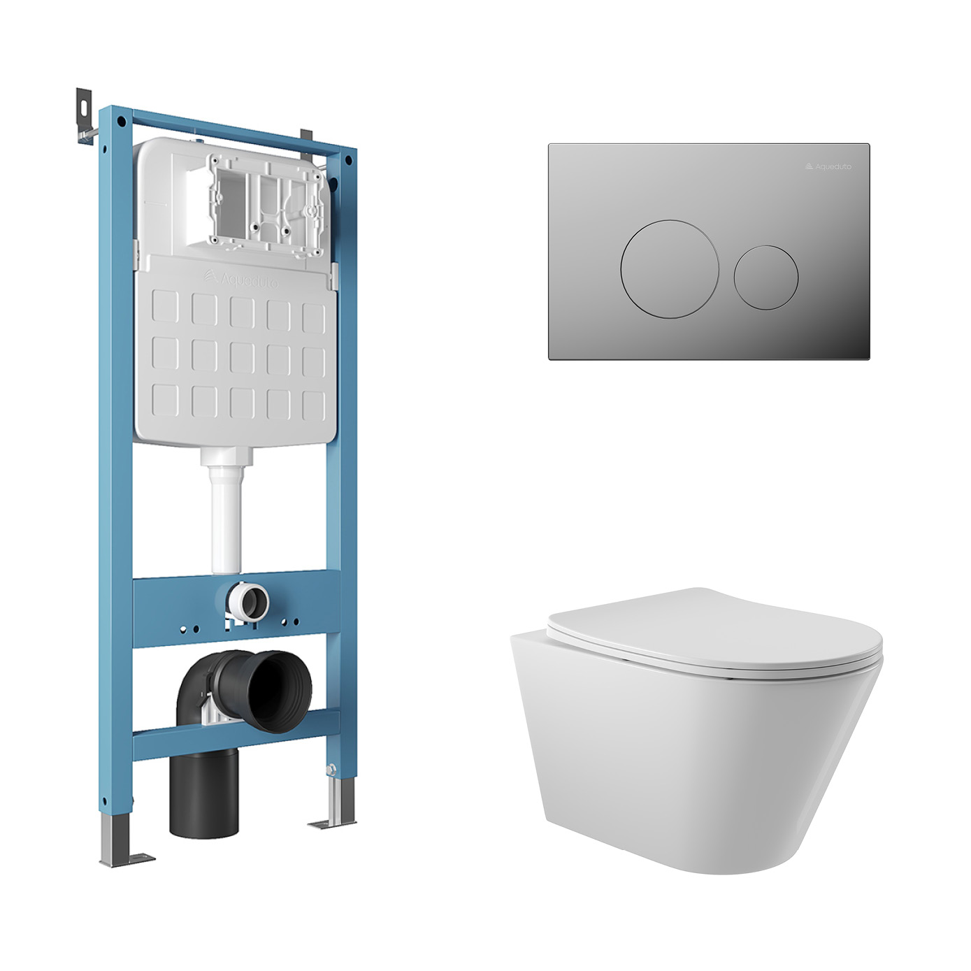 Aqueduto комплект:  TECNICA Novo Система инсталляции для подвесного унитаза,  CIRCULO Novo  Панель смыва, хром,CONE Унитаз подвесной 525*360 безободковый, сиденье с микролифтом, белый глянцевый
