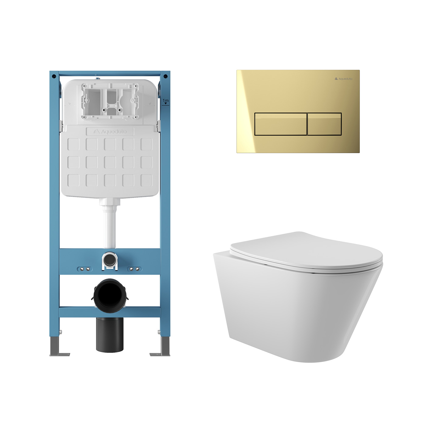 Aqueduto комплект: TECNICA Novo Система инсталляции для подвесного унитаза, RETANGULO Novo Панель смыва, Золото, CONE Унитаз подвесной 525*360 безободковый, сиденье с микролифтом, белый глянцевый