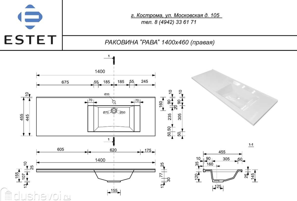 Раковина "Рава 140" 1400х455 правая