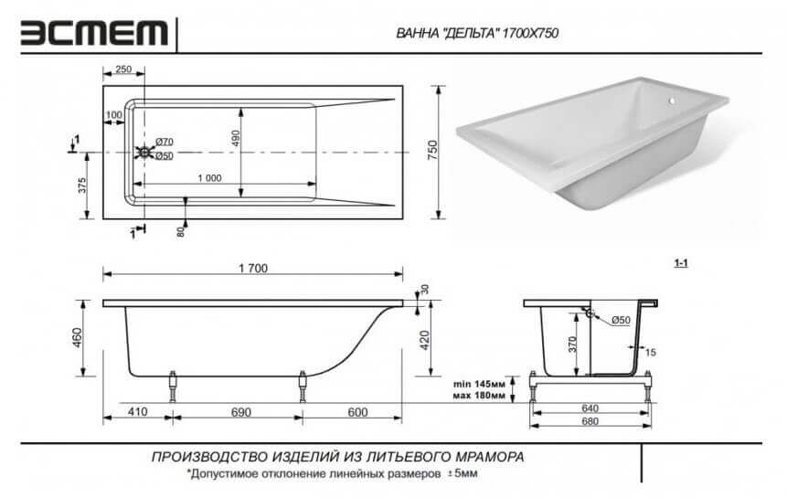 Ванна "Delta 170А slim" 1700х700